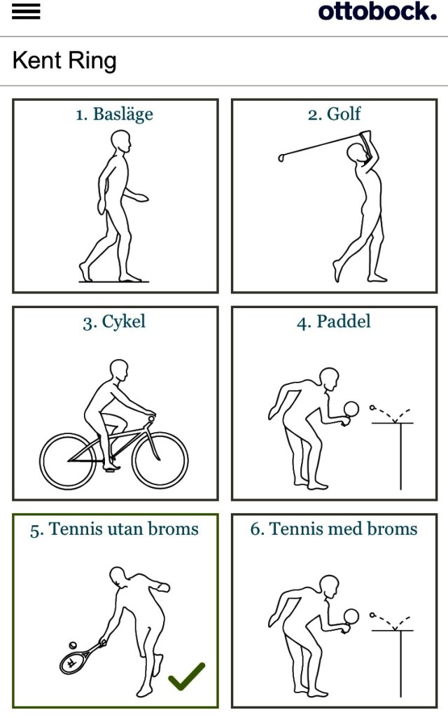Mitt tennismode gör att jag har ett speciellt läge där protesen inte böjer sig mer än förutbestämt. Jag har testat detta mode några gånger och jag upplever det väldigt positivt.