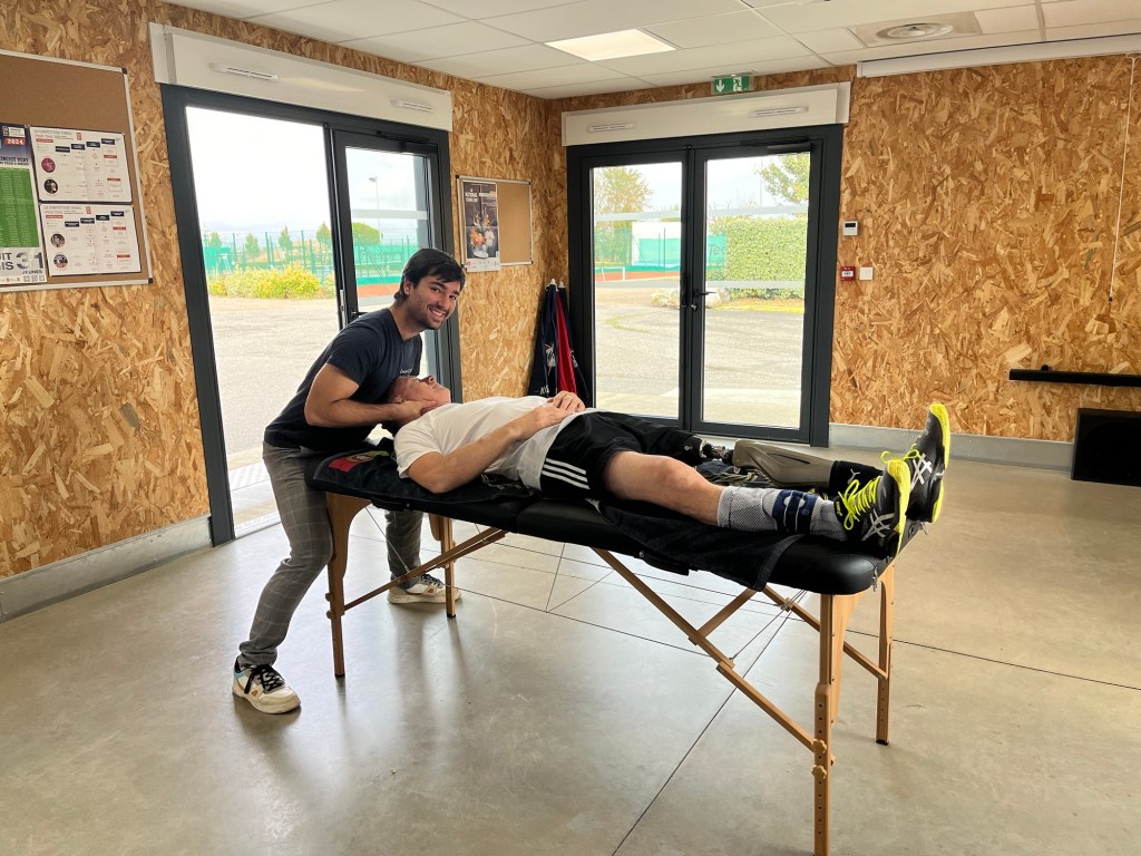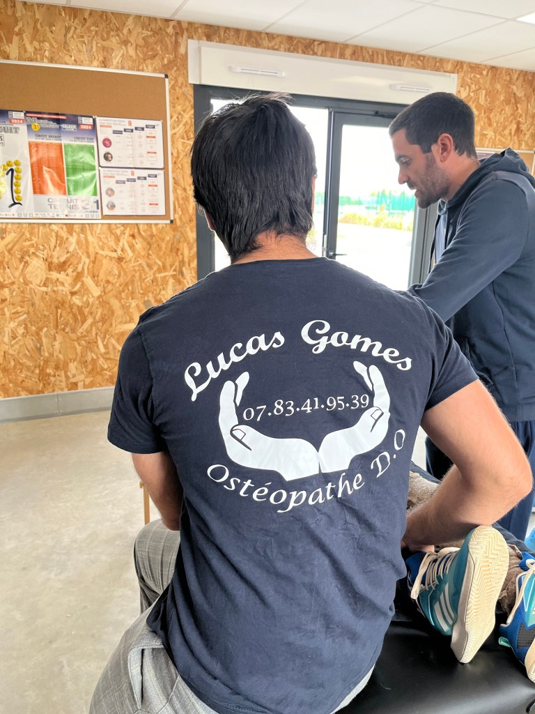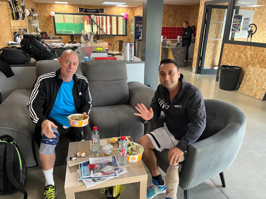Tuff dubbel att börja med, Luis spelade med Cedric och dom var sååååå bra. Man fick ta det som en lektion hur man kan spela. Dock inga sura miner som ni ser.Lunchpaus. Luis pratar inte så mycket engelska och min spanska är inte så bra heller. GOOGLE Translate löste lunchsnacket, vi lovade dock varandra att nästa gång vi träffas så ska vi kunna lite mera både engelska och spanska.Efter lunchen var det match igen, Cedric spelade fantastiskt bra och jag hade inte mycket att ge tillbaka. Efter en tuff match så fick man lite massage av Lucas osteopaten. Jag fick bra betyg att vi min ålder vara så fit, det värmde efter förlusten mot Cedric.
